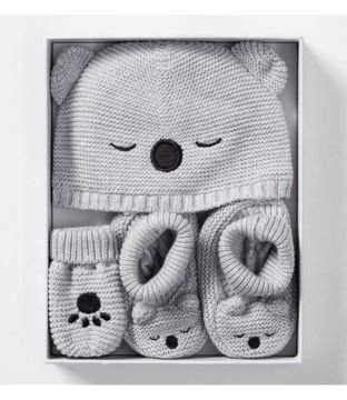 Made from 100% cotton and lined with soft jersey interlock, this set is perfect for keeping little ones warm and snug. The playful koala theme is sure to delight both parents and kids alike, and the cute knitted mittens and booties are too cute!