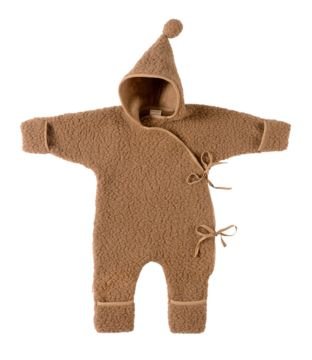 Actual cuteness overload. Made from soft merino wool in a timeless chestnut brown hue, these PJs will keep little bubs warm all winter long. The textured finish, pompom detail, classic hood and side-tie fastening add the perfect touch of cute.